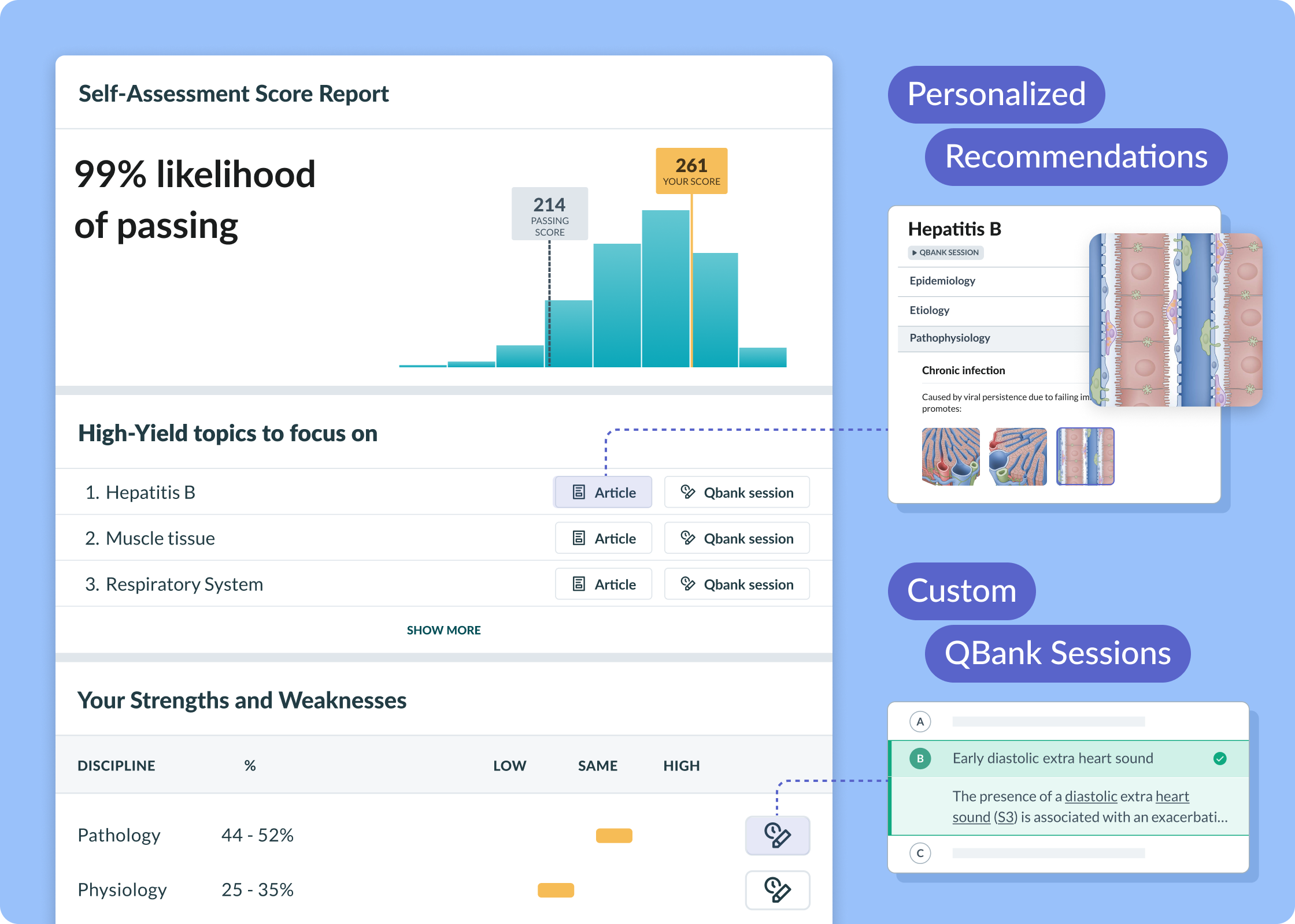Your recommendations will include high-yield articles, study plans, Qbank sessions, Anki recommendations, and more resources you can use to solidify your knowledge of any topic and max out your score!